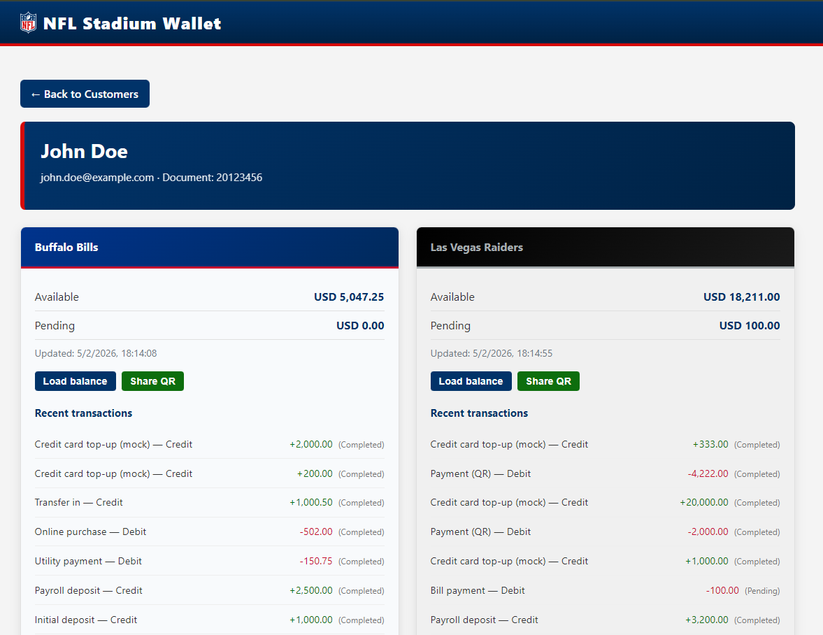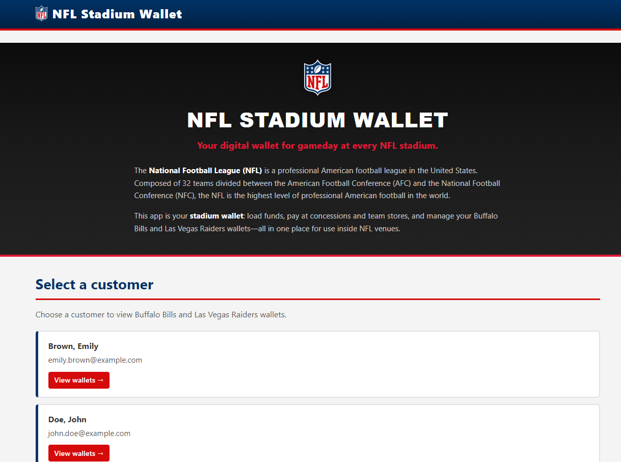 - View customer data and link it to one or more team-specific wallets (e.g., Buffalo Bills, Las Vegas Raiders).