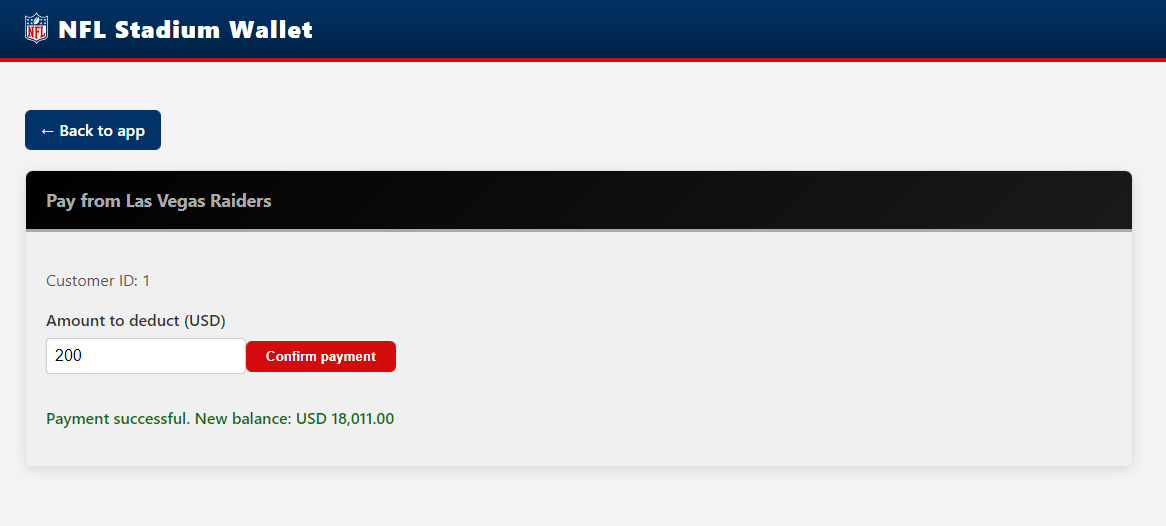 - Backend: Three .NET 8.0 ASP.NET Core APIs (Customers, Buffalo Bills wallet, Las Vegas Raiders wallet).