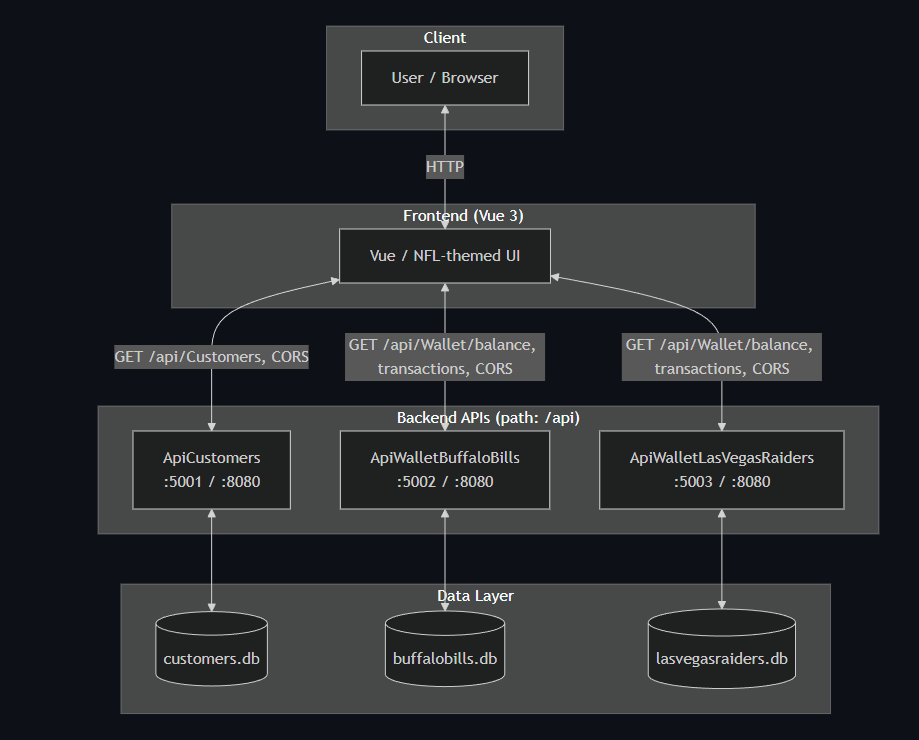 | APIs | .NET 8.0, ASP.NET Core | Three services: ApiCustomers, ApiWalletBuffaloBills, ApiWalletLasVegasRaiders. Path base /api, Swagger at /api/swagger. |