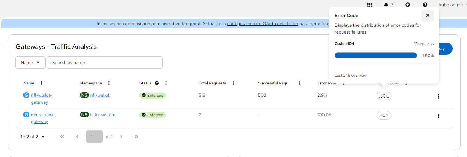 This section describes how to configure observability for the NFL-Wallet gateway so you can view Total Requests, Successful Requests, and Error Rate (and other Istio/Envoy metrics) in the OpenShift observability UI. The configuration uses the Cluster Observability Operator (RHOBS) and is managed via the Helm chart (ThanosQuerier, PodMonitor/ServiceMonitor for the gateway, and UIPlugin).