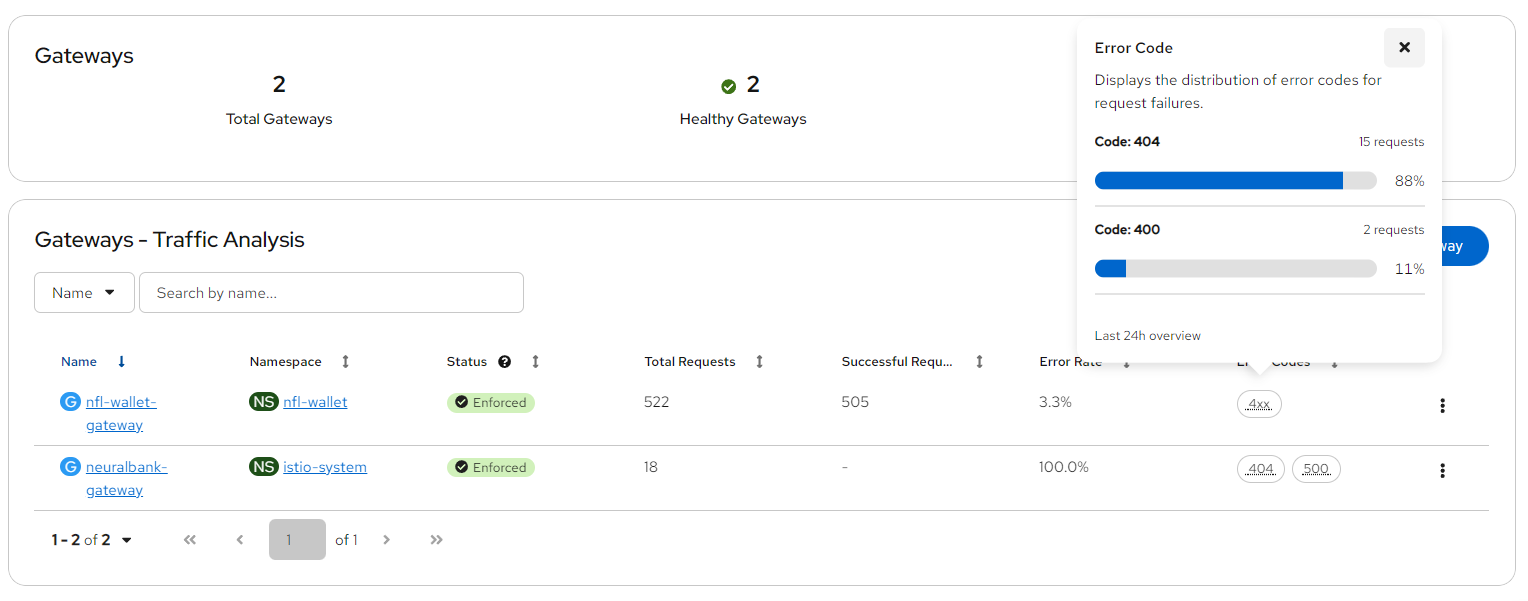 Gateway metrics (e.g. request rate, success and error rates) available in the observability UI after PodMonitor or ServiceMonitor is applied. Click to enlarge.