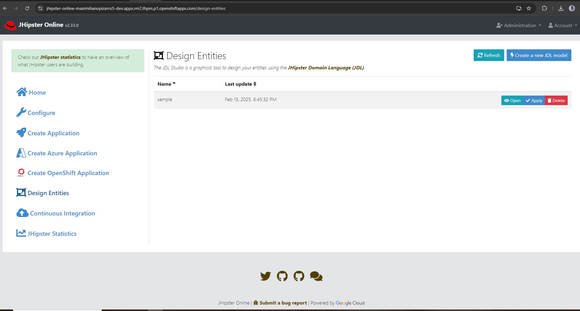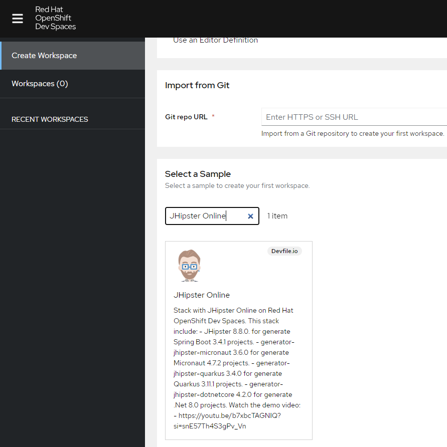 Try on Red Hat OpenShift Dev Spaces, search by “JHipster Online” on the sample catalog and launch the code.