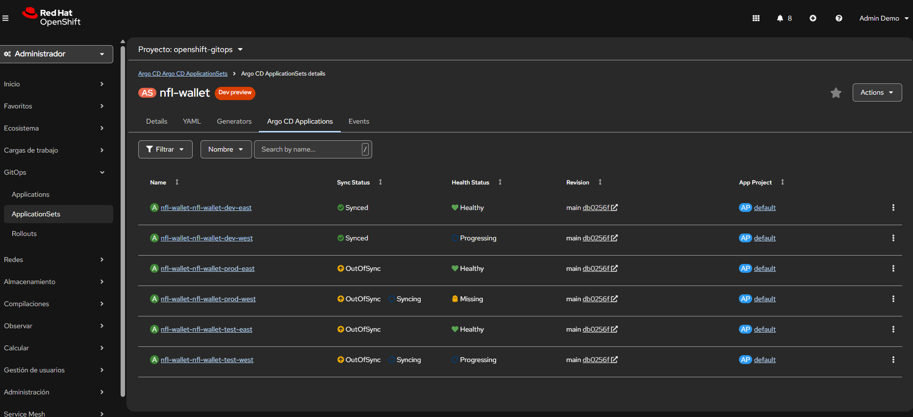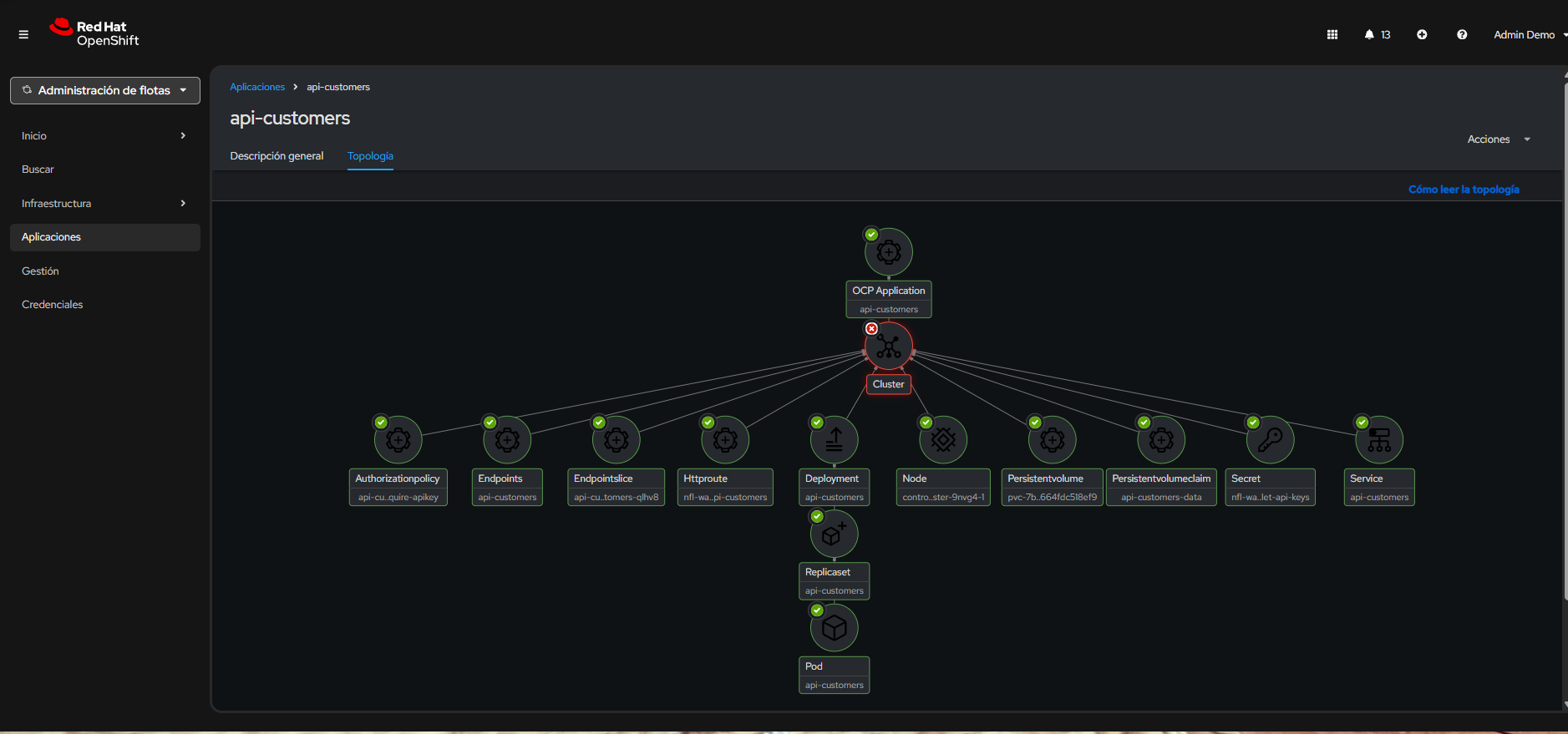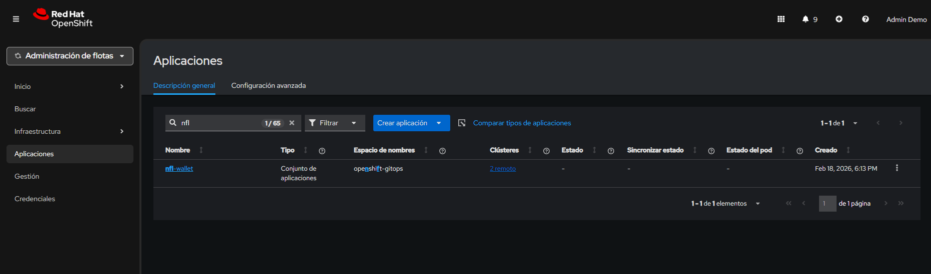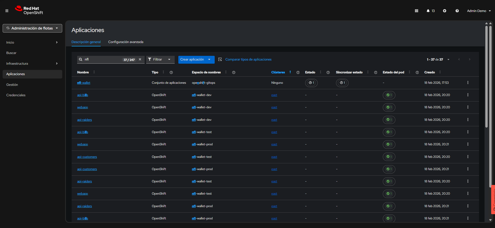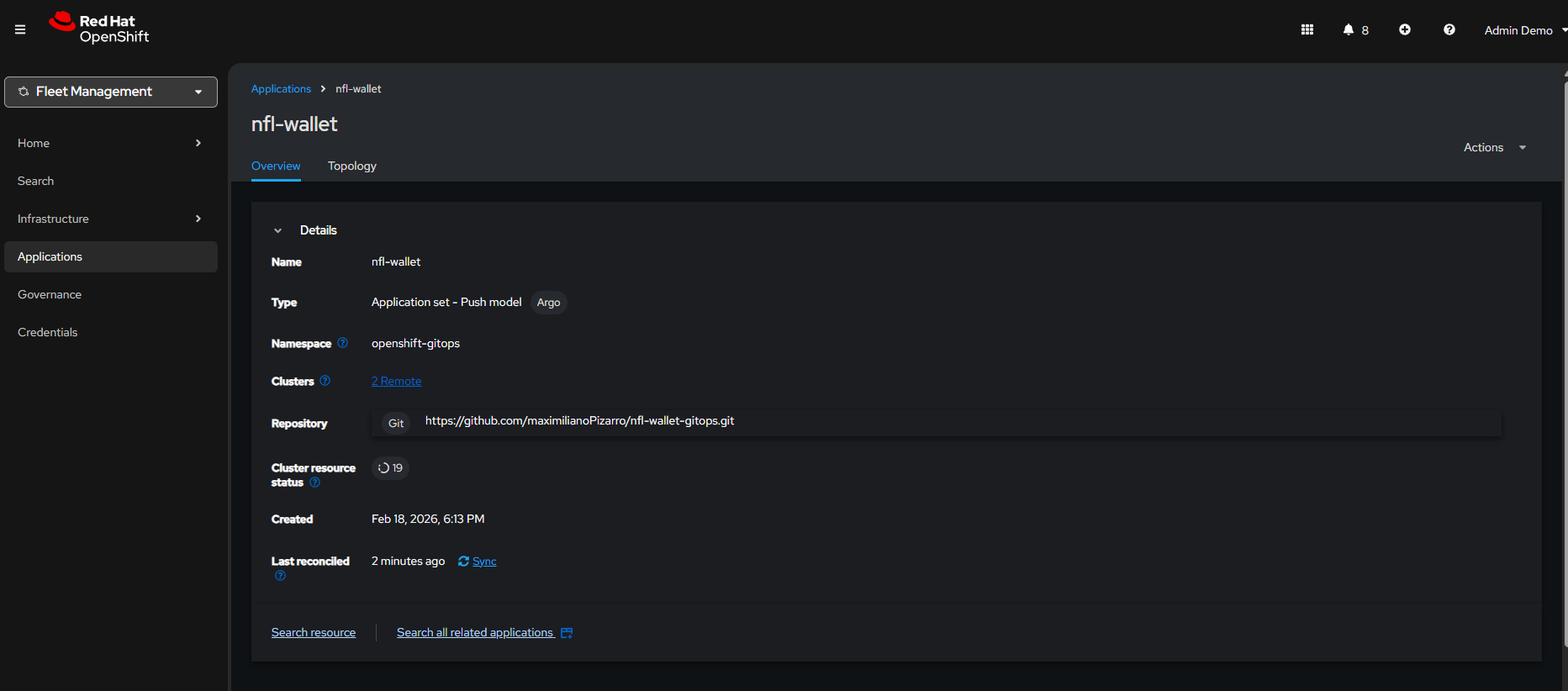 GitOps and cluster management: ArgoCD reconciles the state declared in Git with the actual state of each cluster. ACM complements this by providing the hub and managed clusters topology view, and the status of each distributed Application.