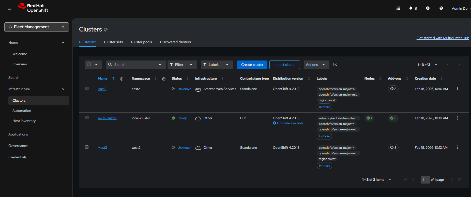 - With ACM: Use the managed cluster domain (east/west), not the hub