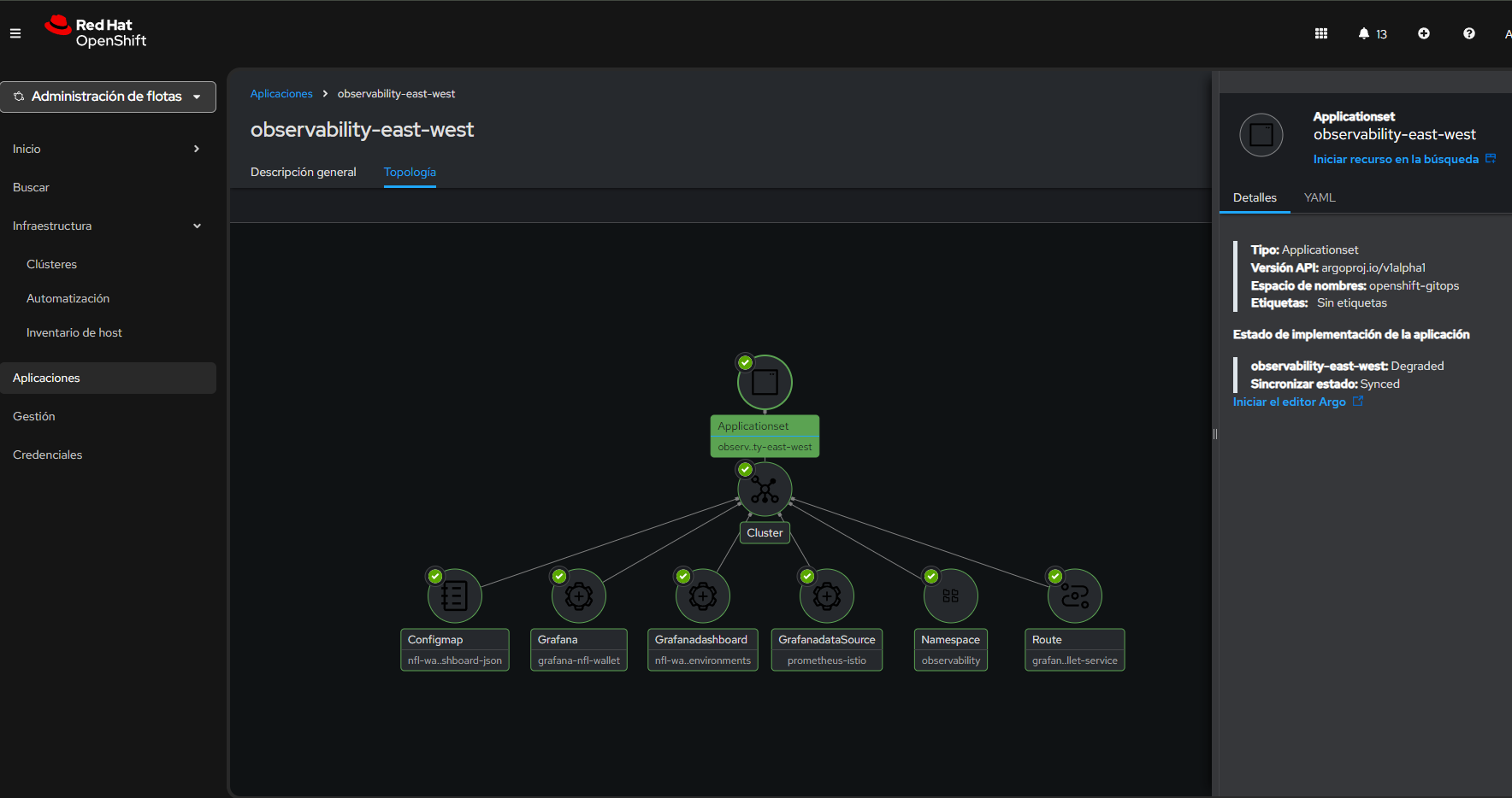 Multi-cluster observability with ACM: ACM manages not only workload deployment but also the observability infrastructure. The observability-east-west ApplicationSet deploys Grafana, dashboards, datasources, and routes identically on both clusters, ensuring a consistent monitoring experience regardless of where services run.