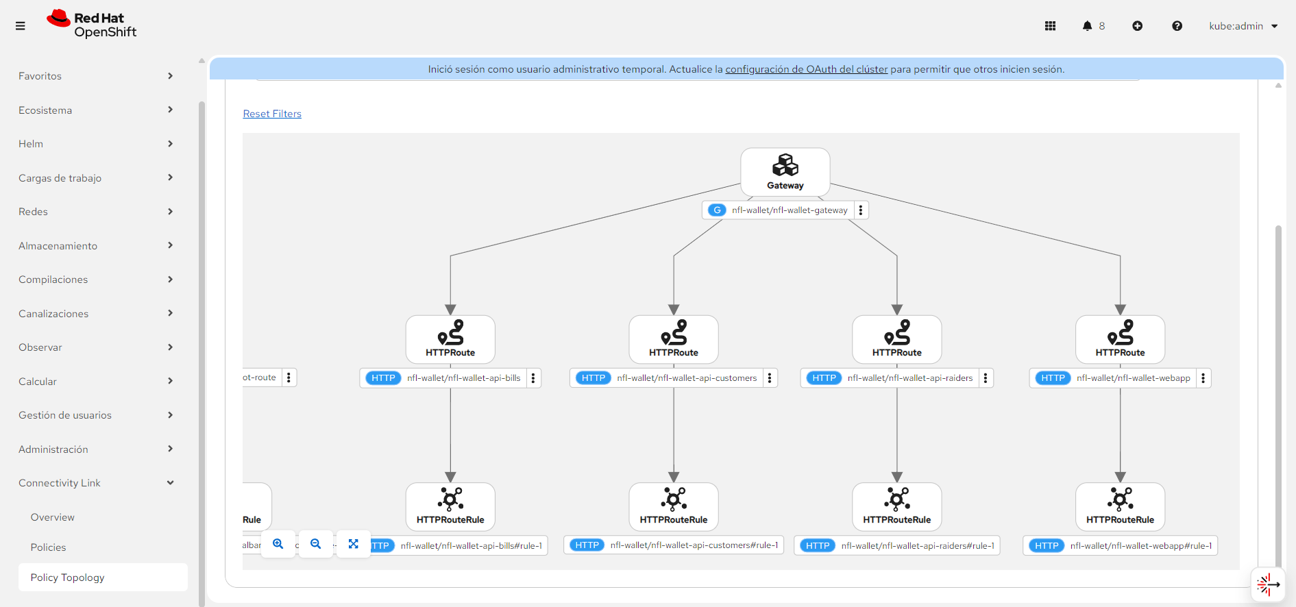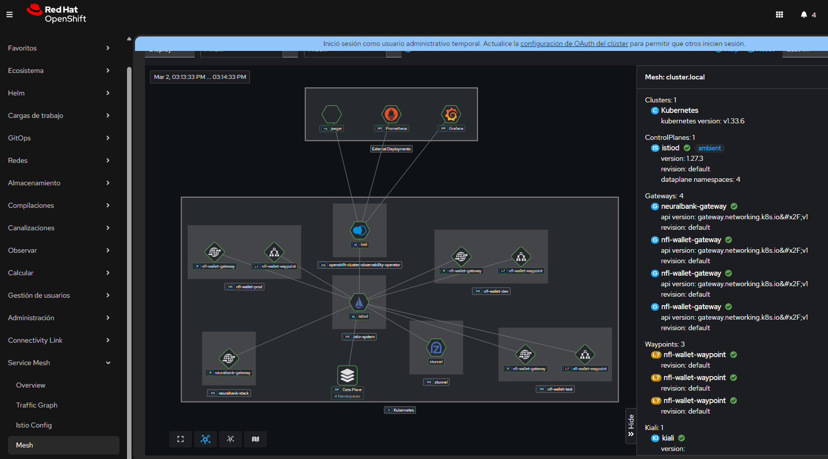 Mesh management from OpenShift Console: The integrated Service Mesh view in OpenShift Console shows active control planes, gateways, and waypoints, providing an operational overview without leaving the management console.