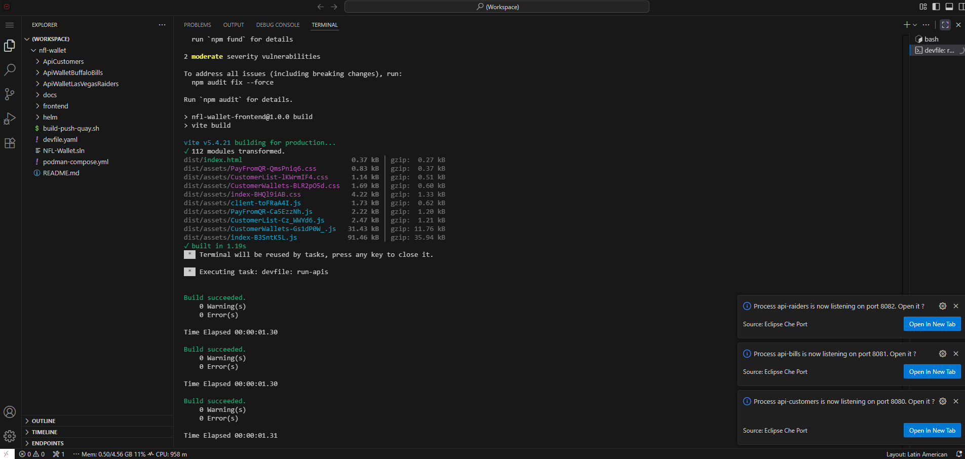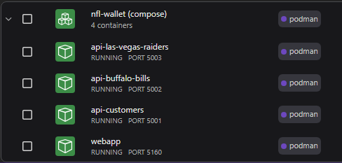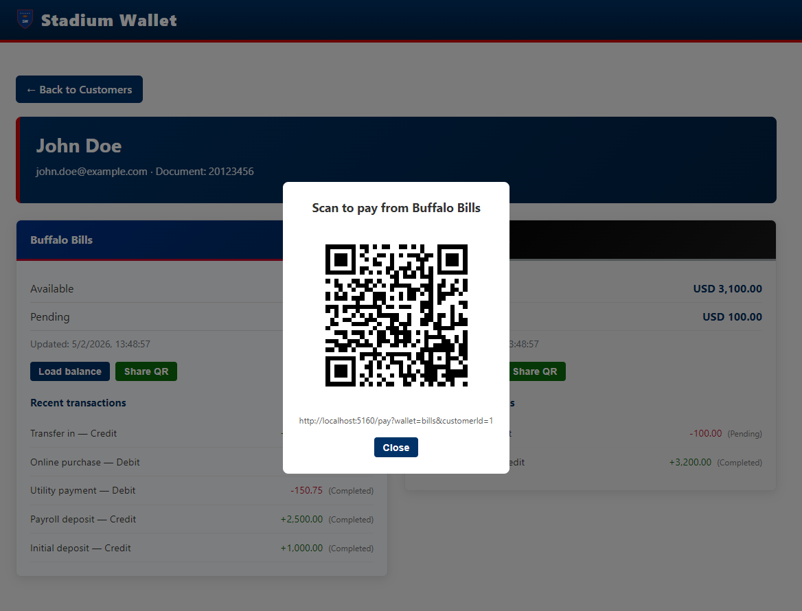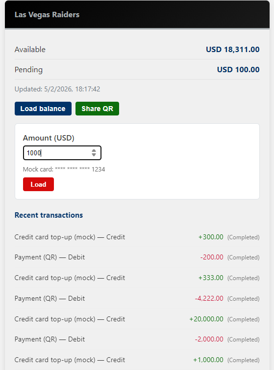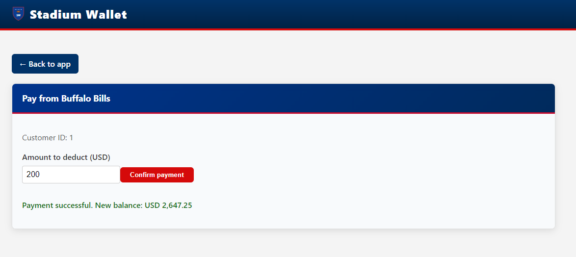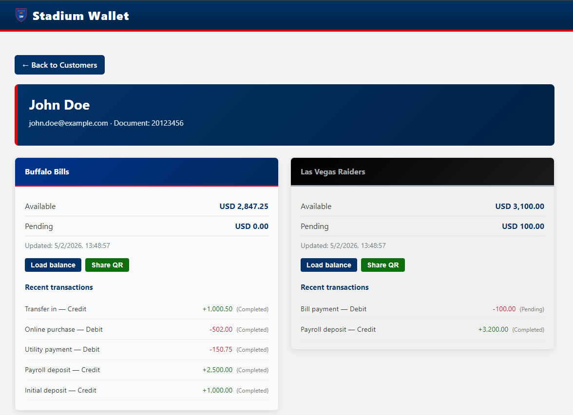 | Backend API | 3 Independent Microservices | .NET 8.0 ASP.NET Core | ApiCustomers (identity), ApiWalletBuffaloBills (Bills transactions), ApiWalletLasVegasRaiders (Raiders transactions) | Independently deployable and scalable |