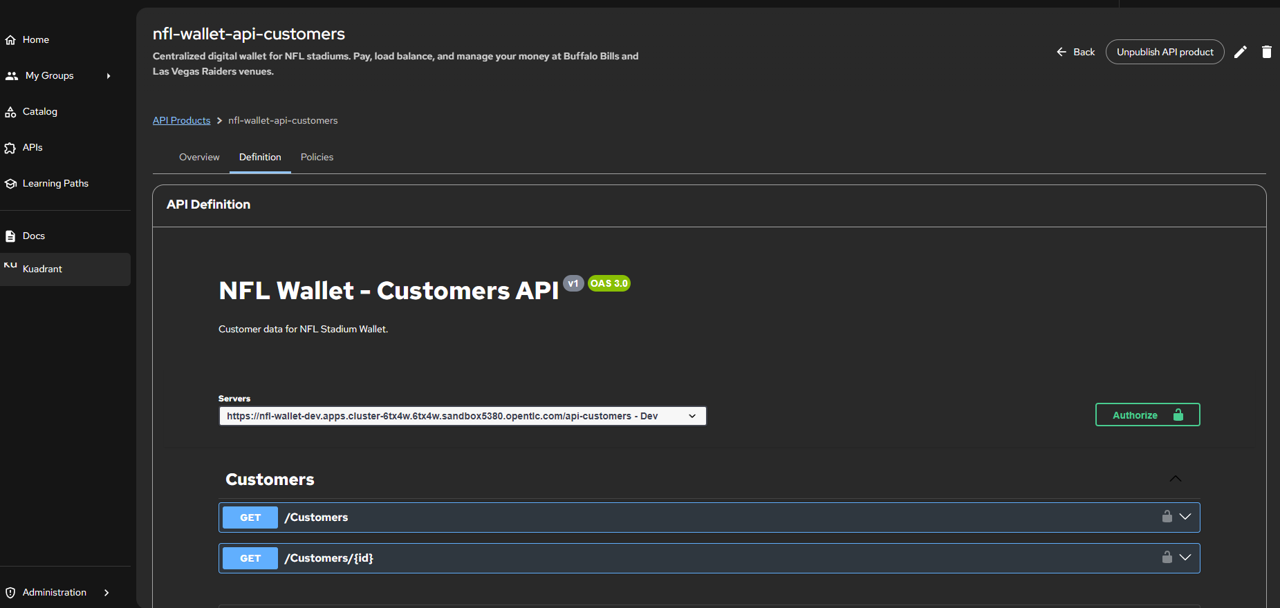 RHDH Kuadrant Plugin — Definition tab: Stadium Wallet - Customers API v1 (OAS 3.0) with documented endpoints and per-environment server selector.