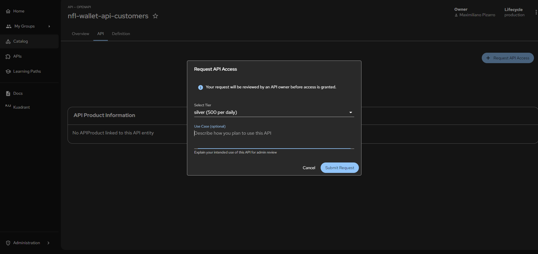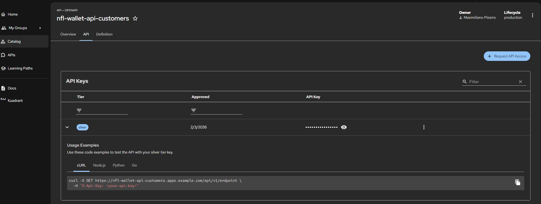 Developer self-service portal: The following screenshots show the complete flow within RHDH: from discovering the API and its policies, to requesting access and obtaining credentials. This flow replaces the manual process of creating tickets and waiting for provisioning — developers obtain their API Key in minutes, with rate limiting tiers already configured.