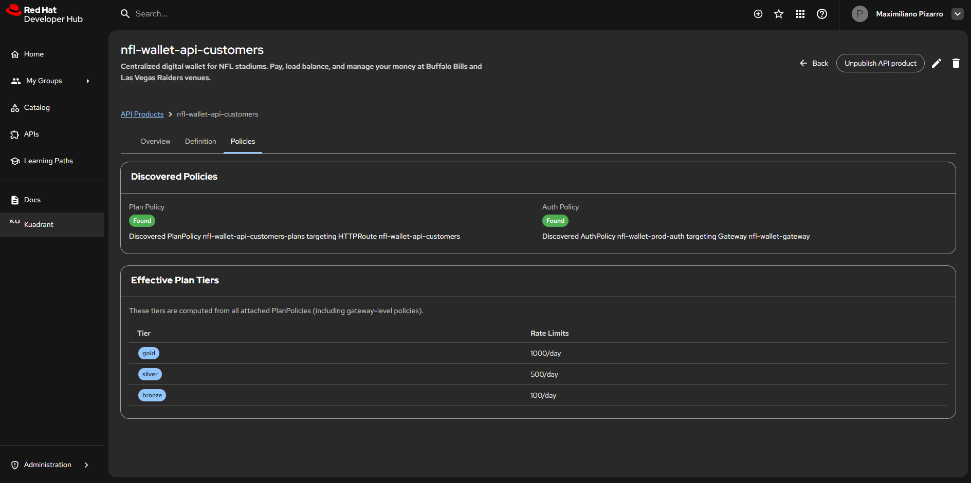 RHDH Kuadrant Plugin — Policies tab: PlanPolicy and AuthPolicy discovered for nfl-wallet-api-customers. Effective tiers: gold (1000/day), silver (500/day), bronze (100/day).