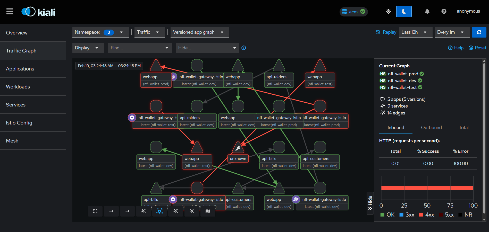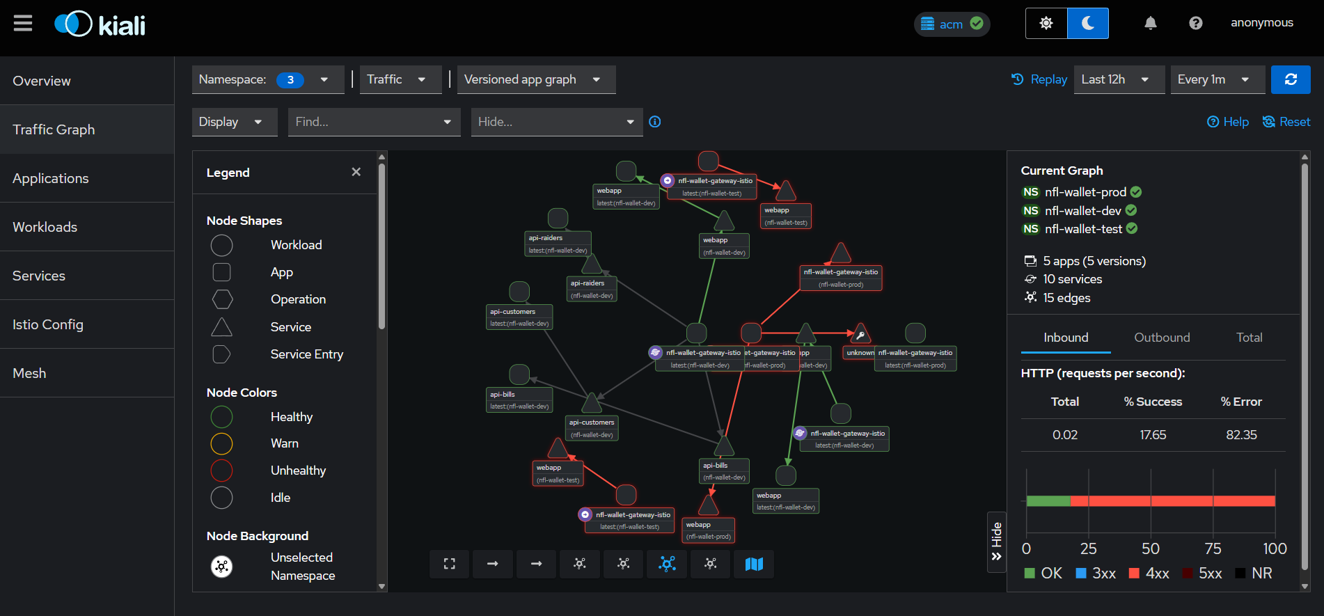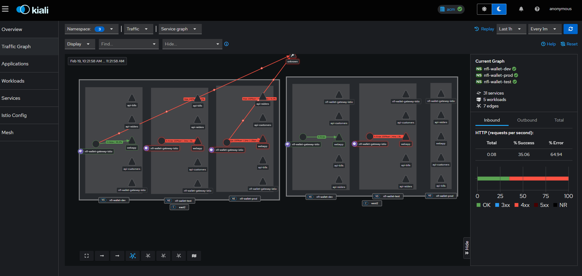 Mesh topology and traffic: Kiali provides real-time visualization of the service graph within the mesh. Nodes represent workloads and edges show observed HTTP traffic with success/error rates. This enables diagnosing connectivity issues without inspecting individual logs.