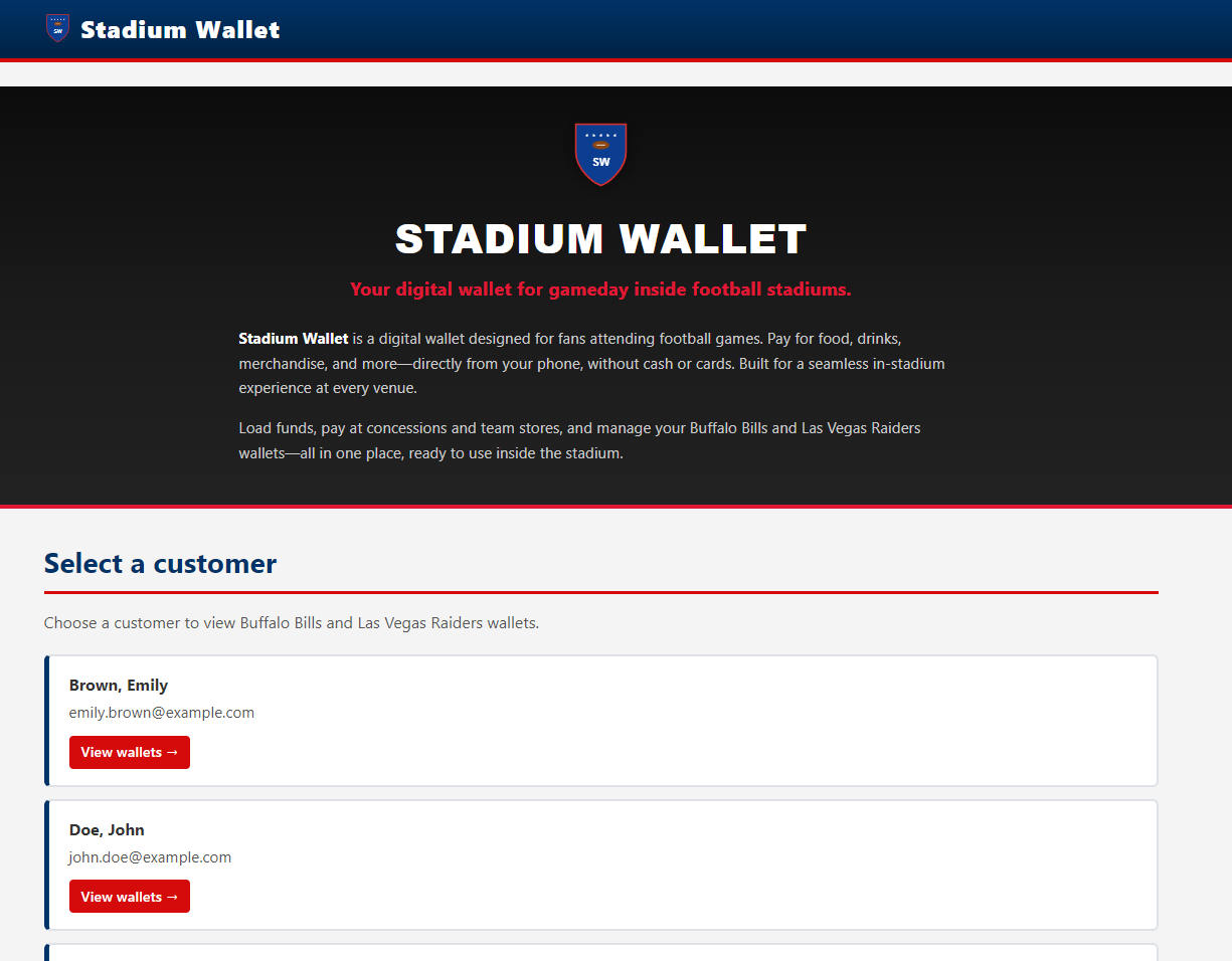 Wallet Landing Page — Entry point of the Stadium Wallet web application.